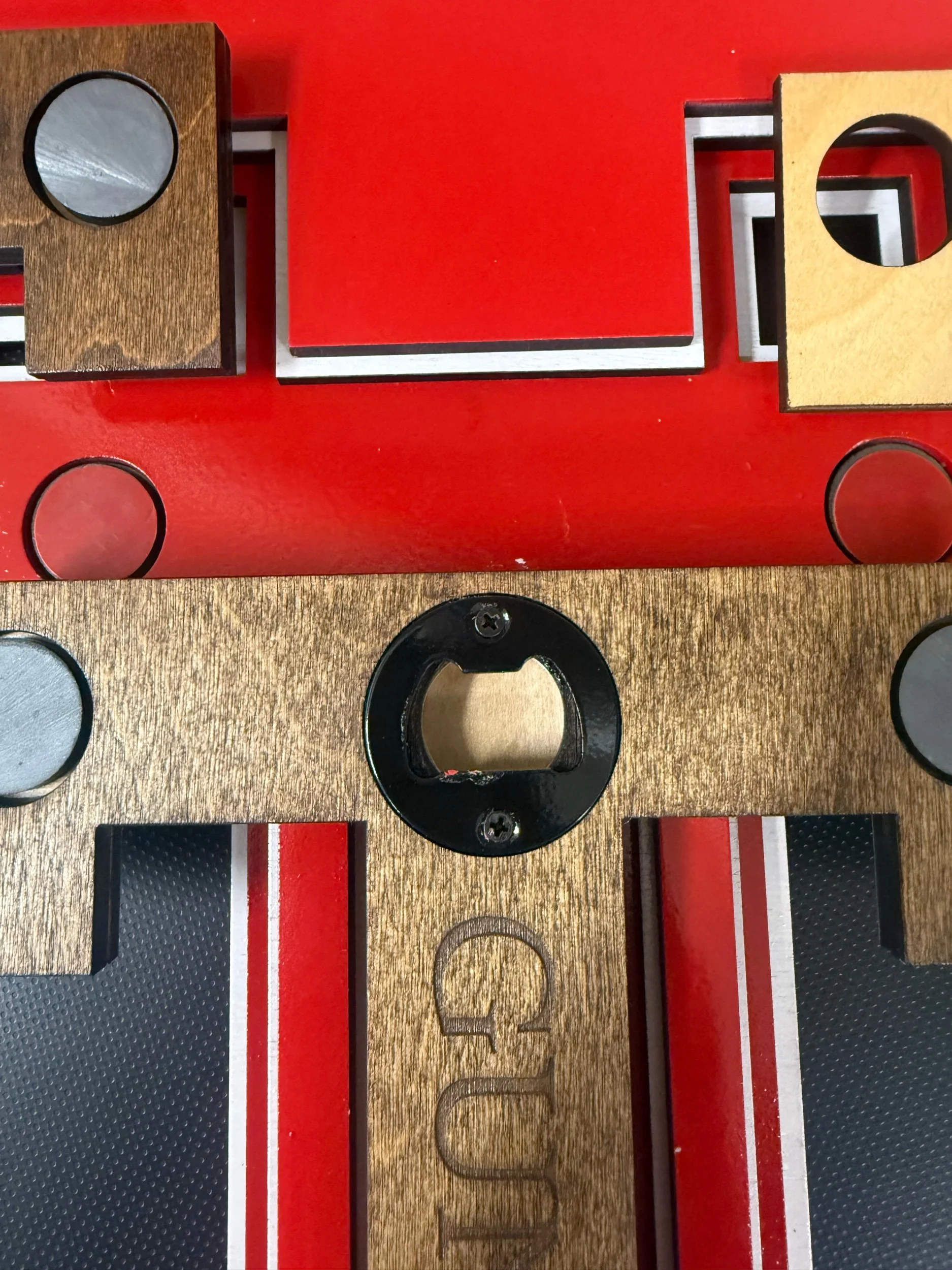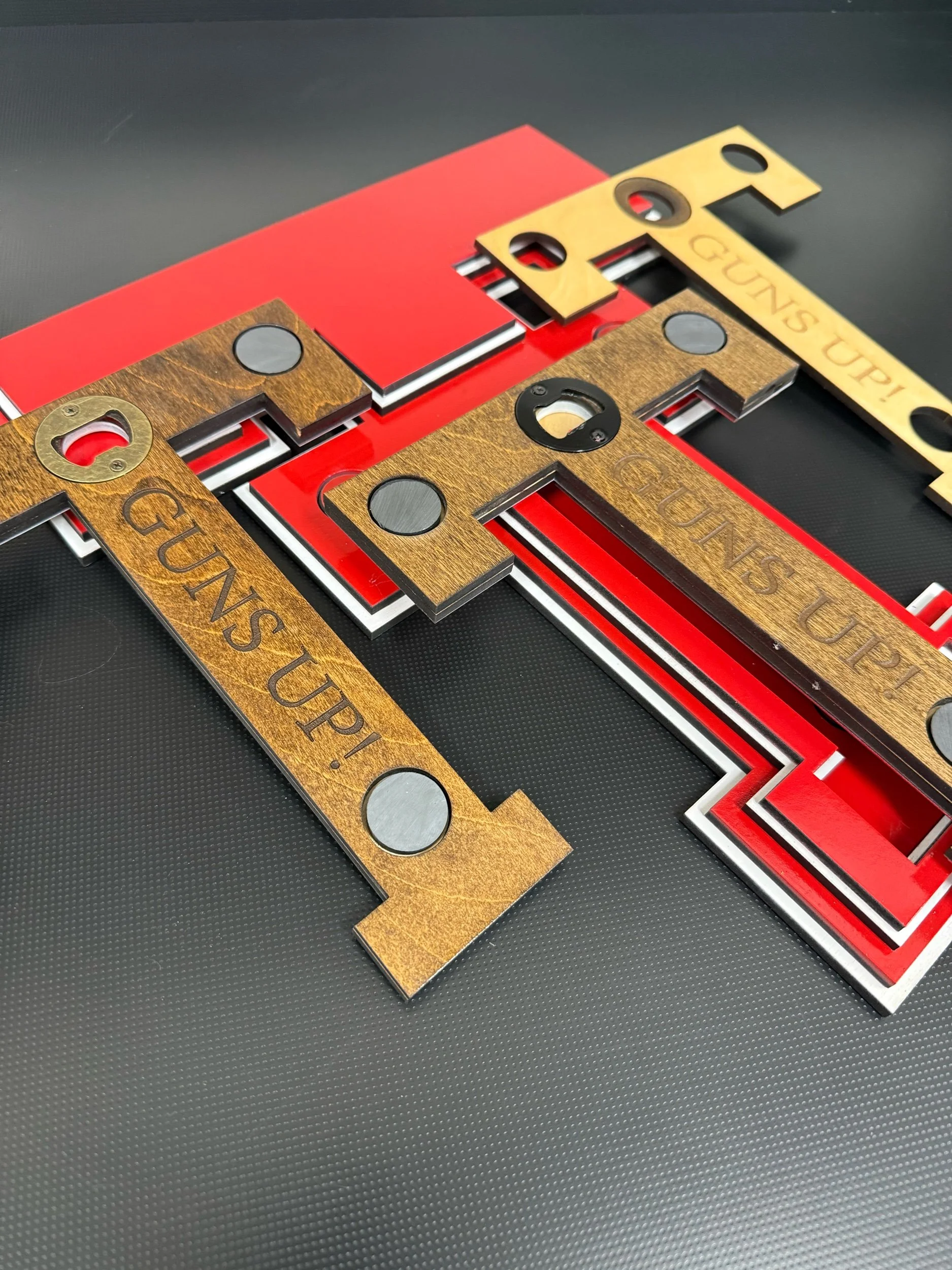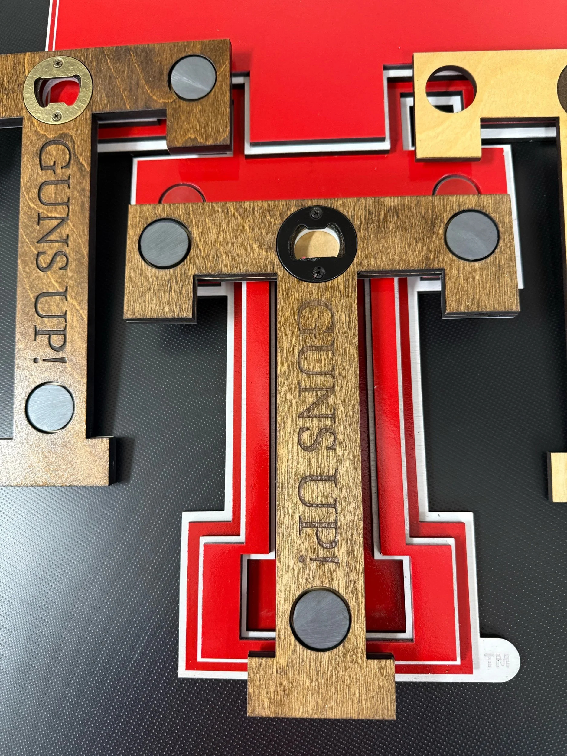 The lower “T” is magnetically attached and doubles as a hidden bottle opener. Pop the piece off, open your drink, and snap it right back into place.